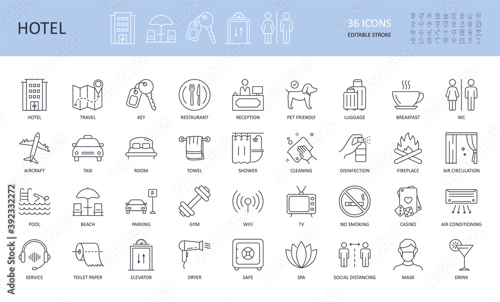 Vector Hotel Service Icons Editable Stroke Set Travel Key Aircraft Taxi Room Restaurant Wc Reception Pet Friendly Casino Luggage Parking Cleaning Spa Wifi Elevator Tv Shower Safe Air Conditioning Stock Vector